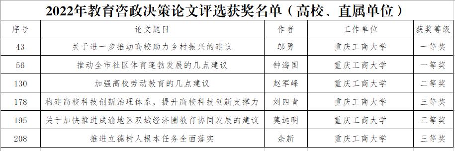 据悉,2022年全市教育咨政决策论文共评选出优秀论文528篇。其中,高校、直属单位组一等奖59篇、二等奖88篇、三等奖78篇。白菜官网教师积极参与教育咨政,围绕高校助力乡村振兴、发展社区体育、加强高校劳动教育、科技创新治理体系、成渝地区双城经济圈教育协调发展、落实立德树人根本任务等深入开展调查研究,积极献言建策,得到了市教委的好评,选送的6篇咨政论文全部获奖,取得显著成效。