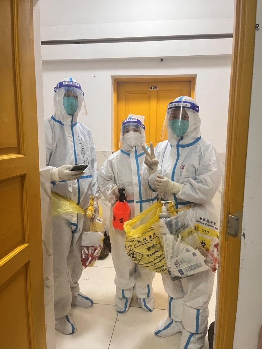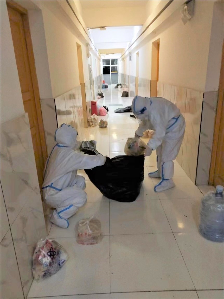 学校第一时间为江北校区增派了志愿者,他们参与流调、配合完成核酸检测,为封控楼栋学生上门单采,送餐……。当脱下密不透风的防护服时,才发现穿在里面的衣服全都湿透了,头发像刚洗过一样。这些可敬可亲的“大白”们,舍小家为大家,守护师生员工的生命安全和身体健康。