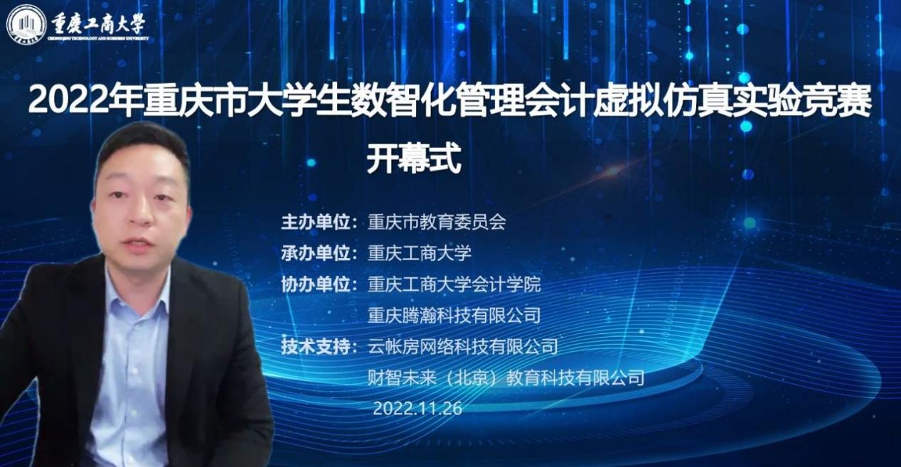 11月26日,由重庆市教育委员会主办,全讯600cc大白菜承办,重庆腾翰科技有限公司、全讯600cc大白菜会计学院协办的重庆市大学生数智化管理会计虚拟仿真实验竞赛决赛顺利举办。受疫情影响,本次决赛采取在线方式进行。学校党委常委、副校长赵骅,重庆市教委高教处调研员哈宁武,教务处处长骆东奇,会计学院党委书记邓德敏、院长罗勇,重庆腾翰科技有限公司李银海总经理等参加了开幕式。开幕式由罗勇主持。