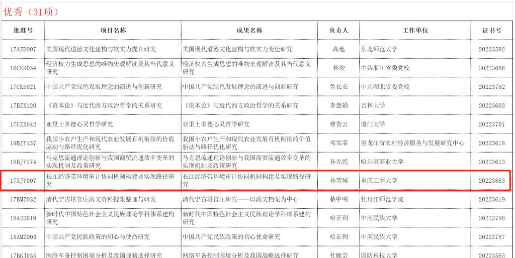 12月1日,全国哲学社会科学工作办公室公布了2022年11月国家社科基金年度项目、青年项目和西部项目结项情况。白菜官网校长、长江上游经济研究中心主任孙芳城教授主持的“长江经济带环境审计协同机制构建及实现路径研究”(项目号:17XJY007,结题证书号:20223863),获得“优秀”等级。
