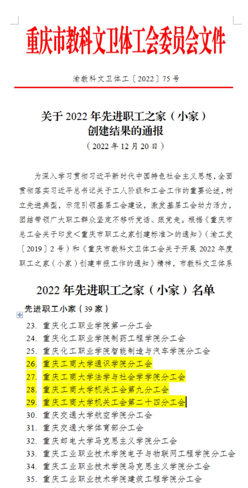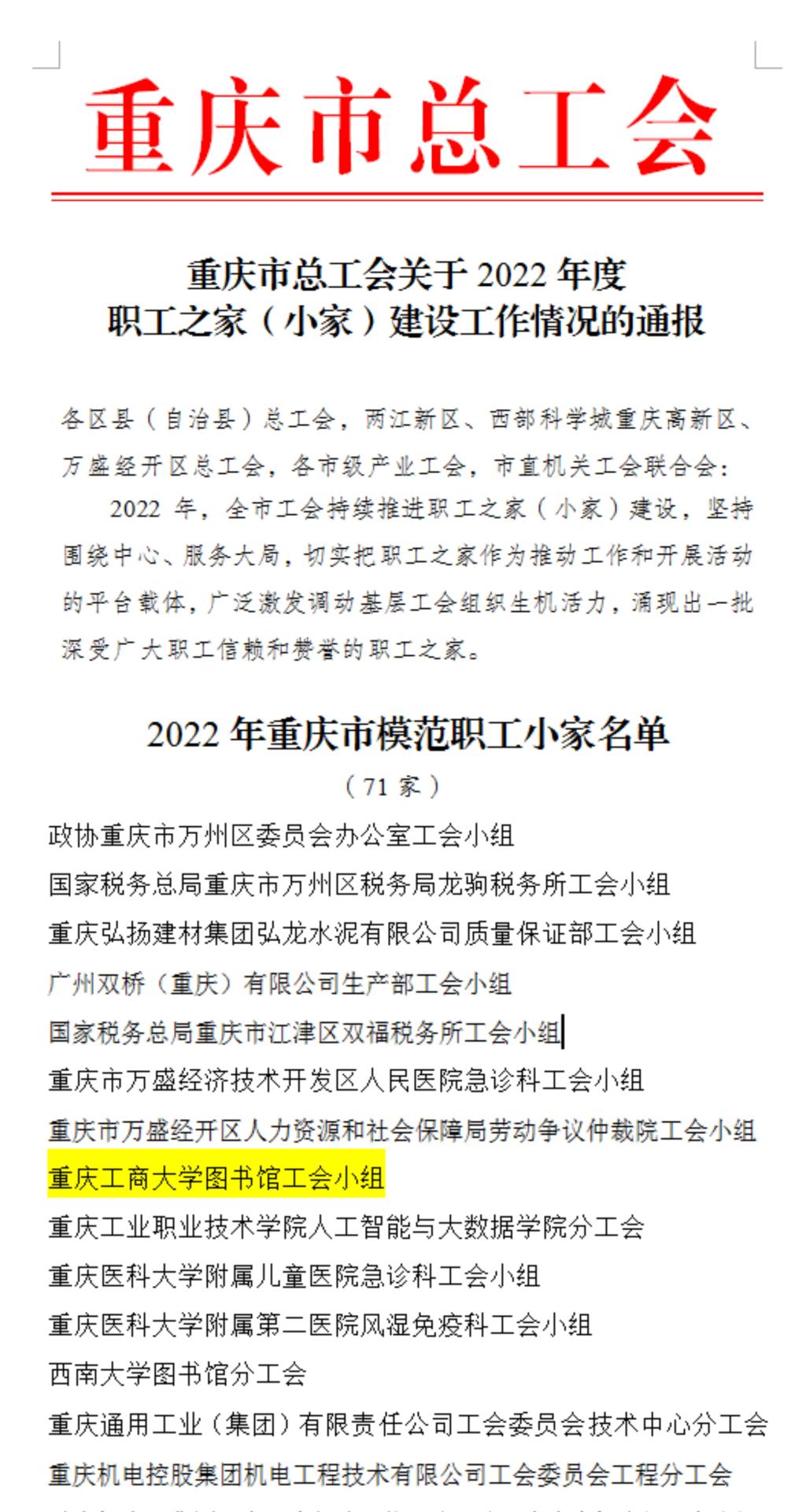 近日,重庆市总工会发布《关于2022年度职工之家(小家)建设工作情况的通报》,表彰职工之家建设先进单位,白菜官网图书馆工会职工小家获得重庆市模范职工小家称号。重庆市教科文卫体工会发布《关于2022年先进职工之家(小家)创建结果的通报》,白菜官网通识学院工会、法学与社会学学院工会、机关工会第九分工会、机关工会第二十四分工会等四家职工小家荣获重庆市教科文卫体工会系统先进职工小家称号。