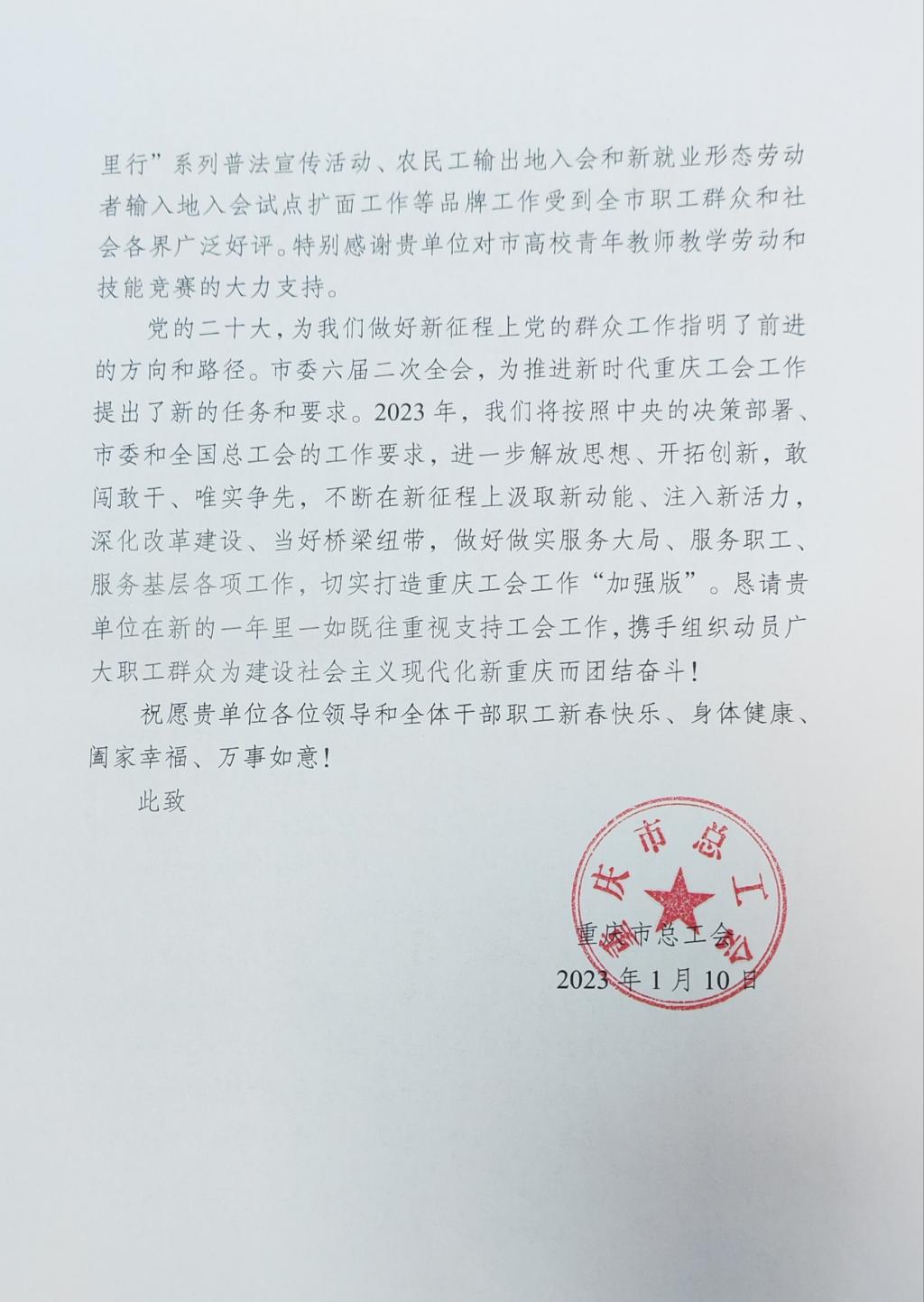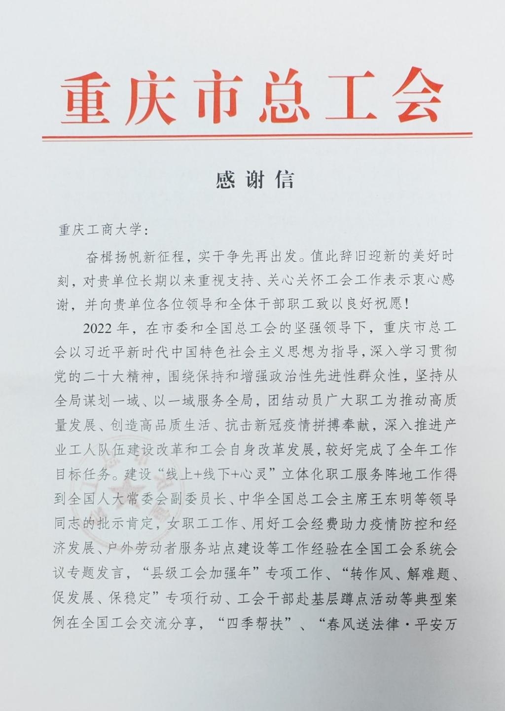 近日,学校收到重庆市总工会感谢信,感谢白菜官网长期以来重视支持、关心关怀工会工作,特别感谢学校对重庆市高校青年教师教学劳动和技能大赛的大力支持。