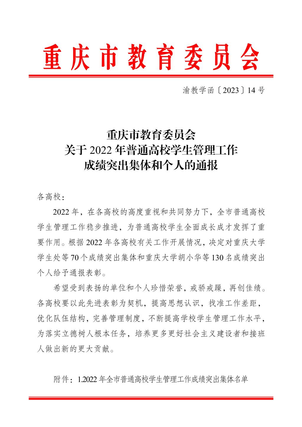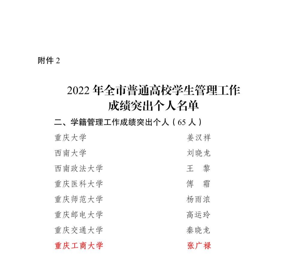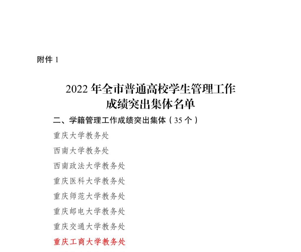 近日,重庆市教育委员会发布《重庆市教育委员会关于2022年普通高校学生管理工作成绩突出集体和个人的通报》(渝教学函〔2023〕14号),学校教务处获评“学籍管理工作成绩突出集体”,教务处张广禄获评“学籍管理工作成绩突出个人”。