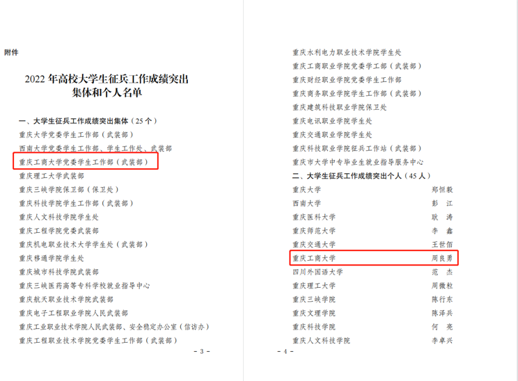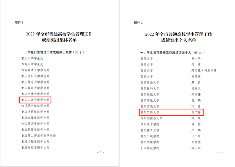 近日,重庆市教育委员会发布《关于2022年普通高校学生管理工作成绩突出集体和个人的通报》(渝教学函〔2023〕14号)和《关于2022年高校大学生征兵工作成绩突出集体和个人的通报》(渝教学函〔2023〕19号)。白菜官网学生处获评“学生日常管理工作成绩突出集体”,白文静同志获评“学生日常管理工作成绩突出个人”;党委学工部(武装部)获评“大学生征兵工作成绩突出集体”,周良勇同志获评“大学生征兵工作成绩突出个人”。