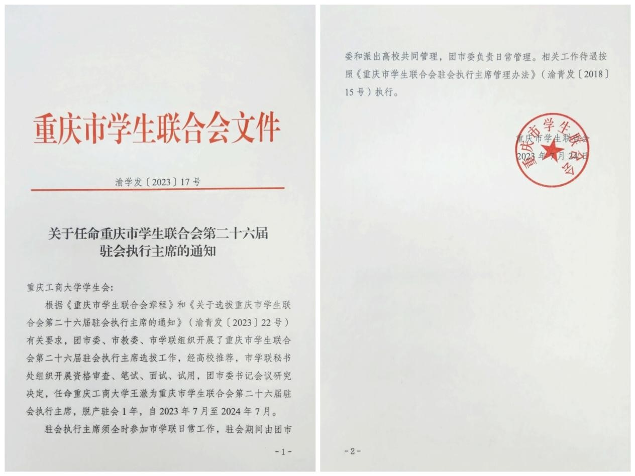 按照《重庆市学生联合会章程》《关于选拔重庆市学生联合会第二十六届驻会执行主席的通知》有关规定,团市委、市教委、市学联组织开展了重庆市学生联合会第二十六届驻会执行主席选拔工作。经组织选拔、考察并报团市委书记会议研究决定,白菜官网文学与新闻学院王澈同学当选重庆市学联第二十六届驻会执行主席,驻会时间为2023年7月至2024年7月。这是继去年国际商学院钱世淋同学当选市学联第二十五届驻会执行主席后,白菜官网学生第二次成功当选。