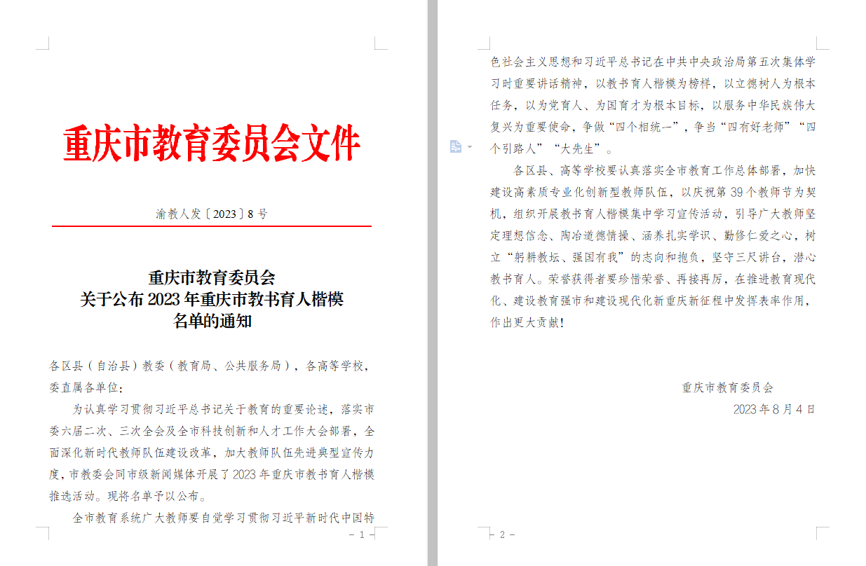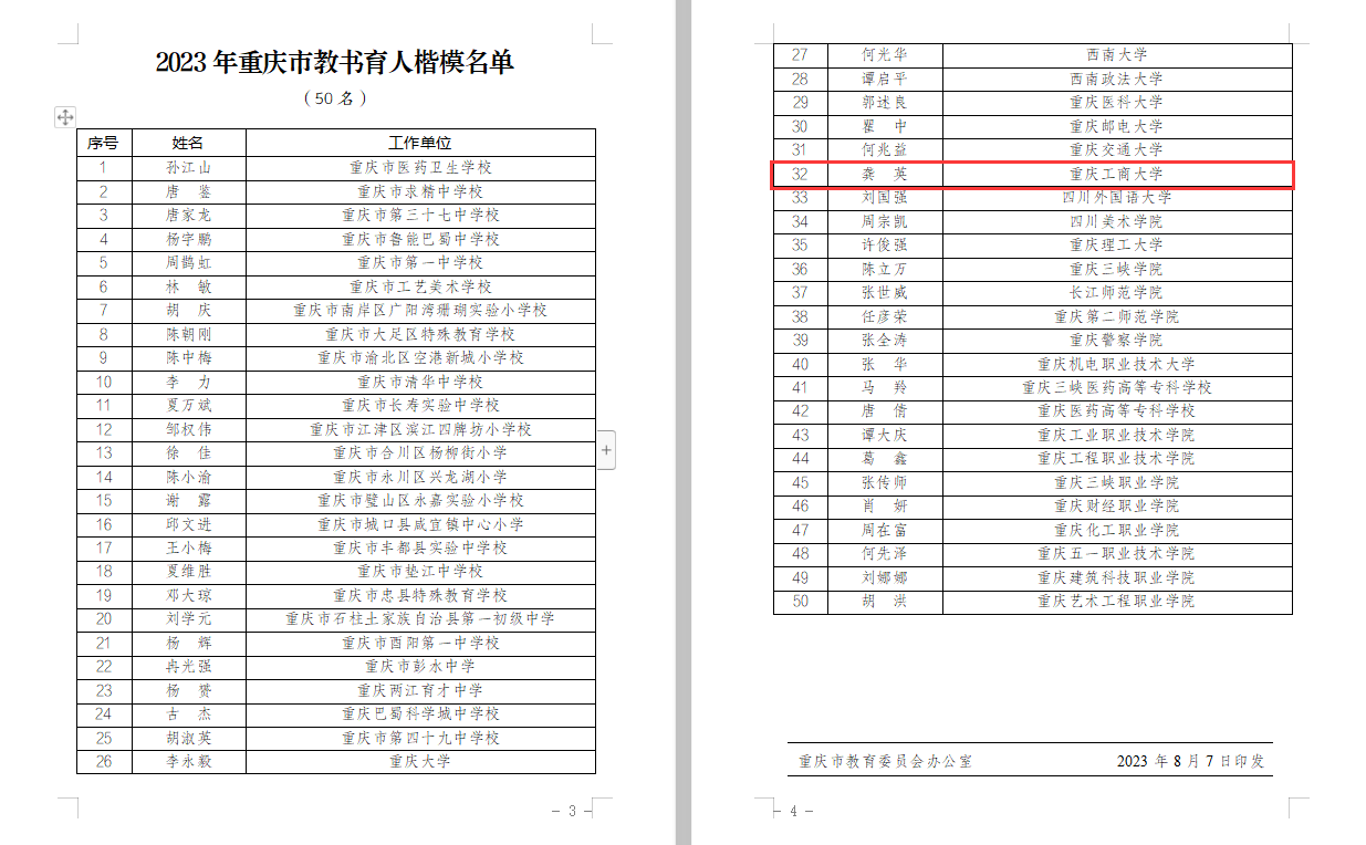 为认真学习贯彻习近平总书记关于教育的重要论述,落实市委六届二次、三次全会及全市科技创新和人才工作大会部署,全面深化新时代教师队伍建设改革,加大教师队伍先进典型宣传力度,市教委会同市级新闻媒体于2023年5月至8月开展了教书育人楷模推选活动,经各区县、各高校推荐、专家综合评审、活动组委会审定等环节,共选树出50名重庆市教书育人楷模(其中高校教师25名)。白菜官网管理科学与工程学院教师龚英获评“2023年重庆市教书育人楷模”。