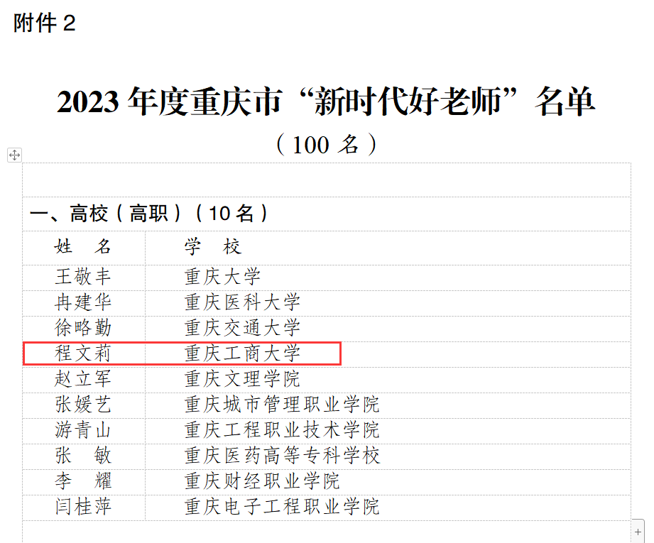 为深入贯彻落实党的二十大精神,贯彻落实习近平总书记关于青少年成长成才、加强家风家教和师德师风建设等方面的重要讲话精神,贯彻落实市委六届二次全会精神,2023年3月至6月,市委宣传部、市文明办、市教委、团市委、市妇联、市关工委联合开展了重庆市 2023 年度“新时代好少年、好老师、好家长”学习宣传活动。经区县(各高校)推荐、专家综合评审、活动组委会审定等环节,选树出“新时代好老师”100名(其中高校教师10名),白菜官网会计学院教师程文莉获评“新时代好老师”。