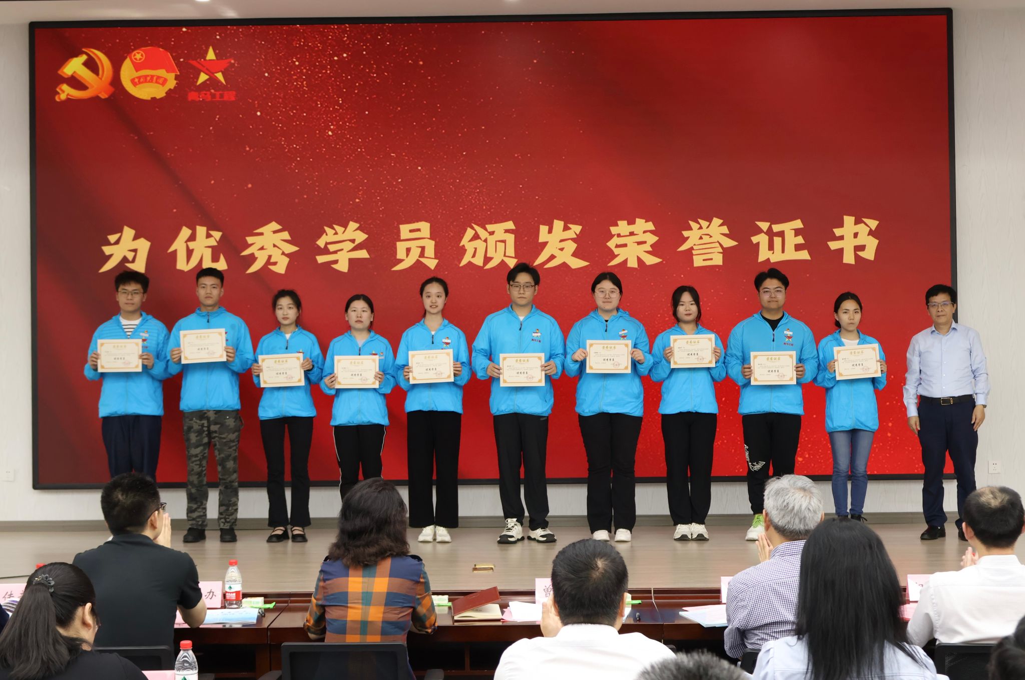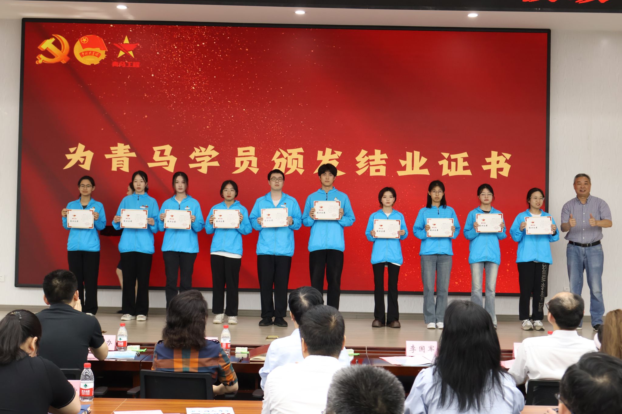 曾维伦为优秀学员代表颁发荣誉证书,宋豫为“青马学员说”微视频比赛获奖作品颁奖,李国军颁发青马学员结业证书。