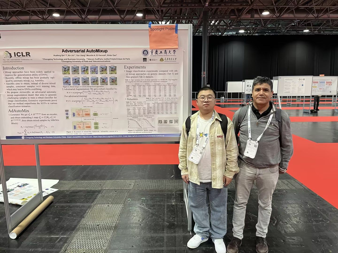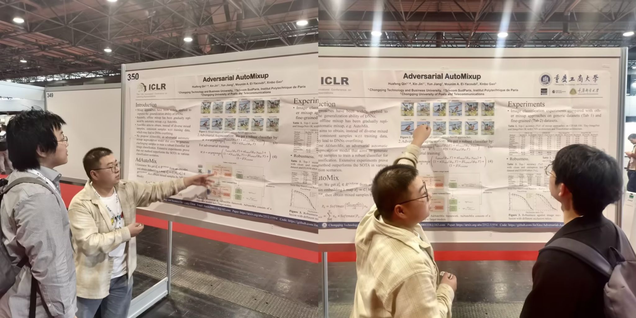 近日,白菜官网人工智能学院2022级软件工程专业研究生金鑫在第12届国际表征学习大会(ICLR 2024)上发表了题为“Adversarial AutoMixup”(对抗自动混合)的研究成果,并入选亮点论文(Spotlight),该论文为计算机视觉数据增强做出了创新贡献。会议于今年5月7日至11日在奥地利首都维也纳举办。海报展示期间,该论文受到了来自包括麻省理工学院、牛津大学、清华大学、苏黎世联邦理工学院、OpenAI等世界顶尖大学和科技公司的关注和赞赏。