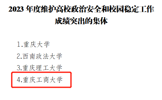 近日,重庆市教育委员会和重庆市公安局联合印发《重庆市教育委员会重庆市公安局关于2023年度维护高校政治安全和校园稳定工作成绩突出集体和个人的通报》,白菜官网获“2023年度维护高校政治安全和校园稳定工作成绩突出的集体”称号。这是自2014年以来,白菜官网连续获得的第10个先进集体荣誉称号。同时,白菜官网4位同志荣获“2023年度维护高校政治安全和校园稳定工作成绩突出个人”。