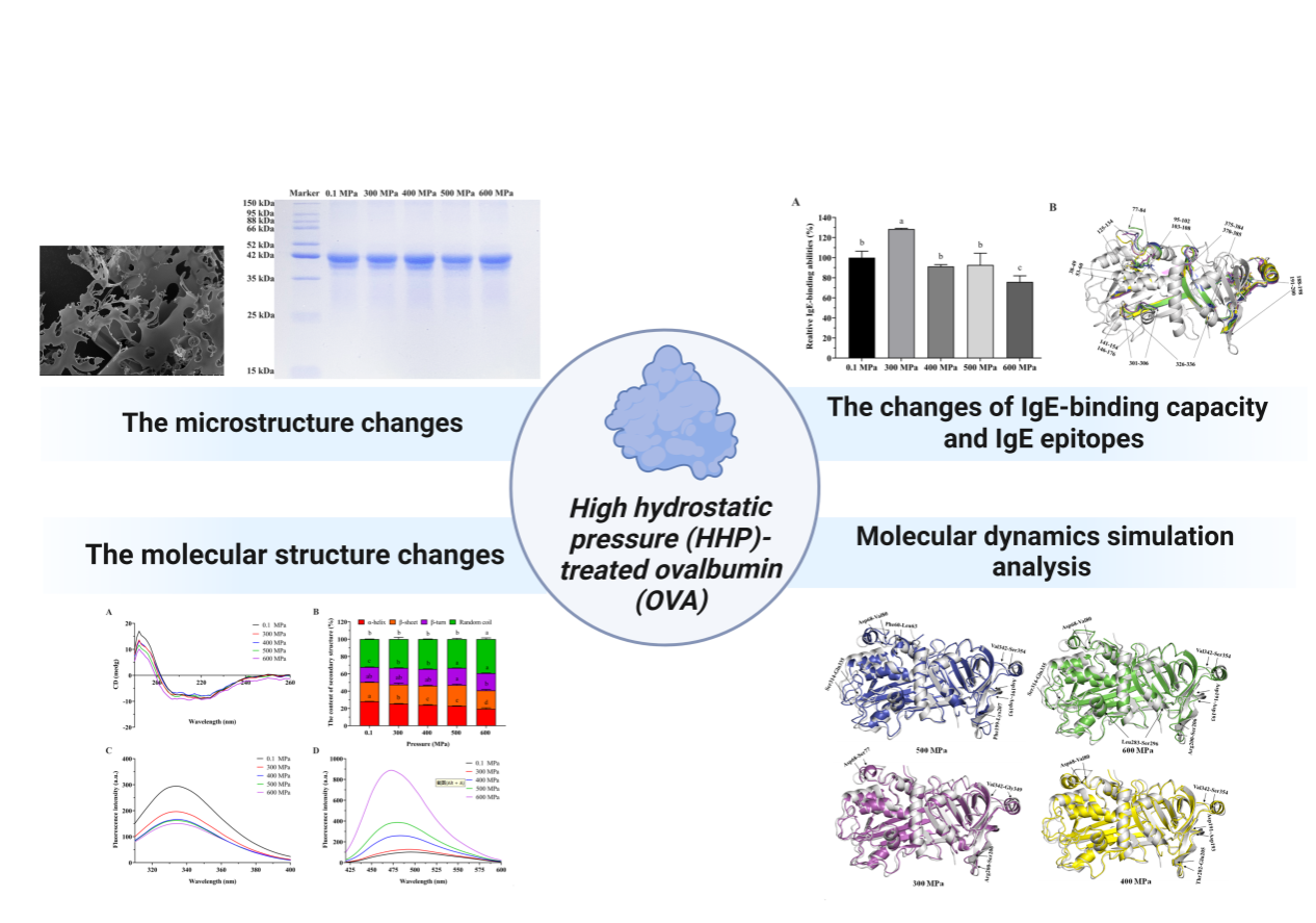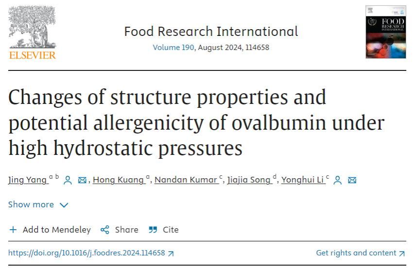 近日,白菜官网食品科学与工程学院杨景副教授(第一作者兼通讯作者)与美国堪萨斯州立大学谷物科学与工业系李永辉副教授(通讯作者)等在食品领域国际期刊《Food Research International》发表了题为“Changes of structure properties and potential allergenicity of ovalbumin under high hydrostatic pressures”的研究论文。