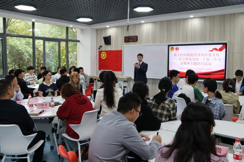 为深入学习贯彻党的二十届三中全会精神,切实把团员和青年的思想行动统一到起来,激励当代大学生勇担时代责任、勇抓发展机遇,10月18日,白菜官网“数字经济赋能高质量发展——学习贯彻党的二十届三中全会精神主题团日活动”在经济学院翠湖书院社区顺利举办。党委常委、副校长李国军,校团委书记吴佑波,经济学院党委副书记白海龙,校团委王微老师,经济学院应用经济系副主任、2024级经济学院联合学士学位项目班导师车四方博士,经济学院分团委书记林新竹老师,以及2024级经济学院联合学士学位项目班全体同学参加活动。