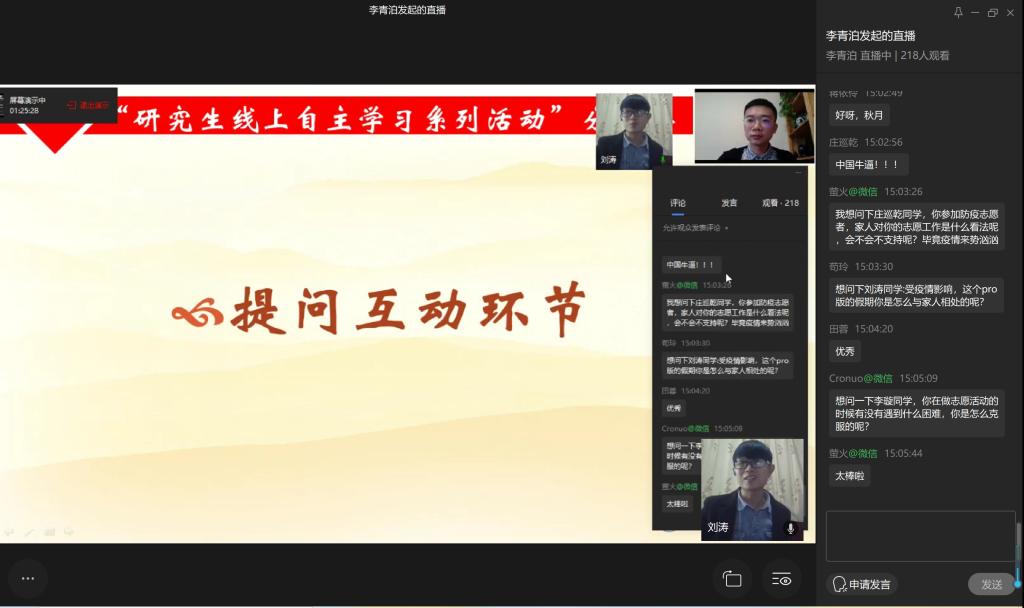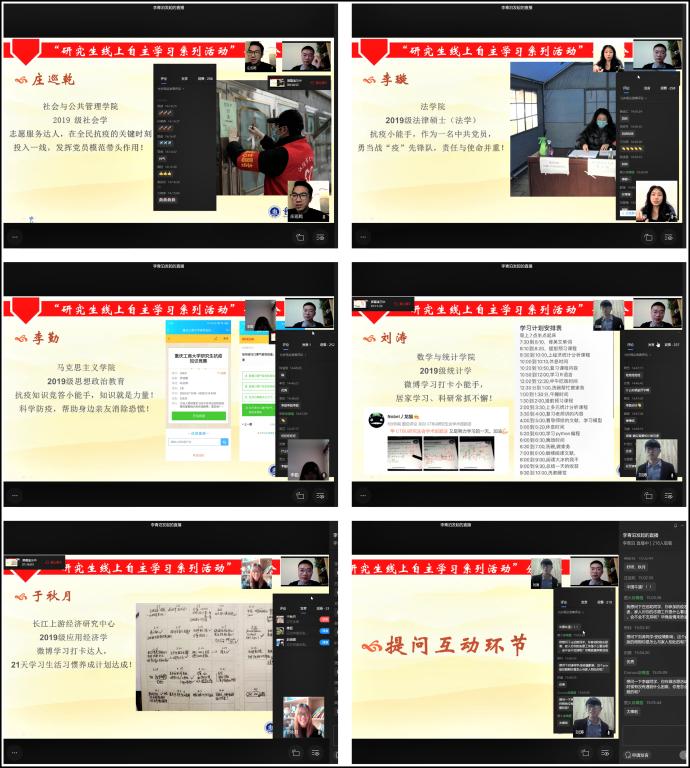 来自2019级社会学专业的志愿服务达人庄巡乾同学,首先就抗疫志愿服务工作与大家做分享交流,庄同学分享了他在抗疫志愿服务期间的工作日常和生活趣事,并表示作为一名中共党员,要积极发挥党员模范带头作用,遇事不害怕、不退缩,在全民抗疫的关键时刻投身基层一线,为打赢抗“疫”阻击战贡献自己的青春力量。同为抗疫志愿者的2019级法律硕士(法学)专业的李璇同学也分享了她在抗“疫”期间的心得体会:作为一名中共党员,必须守住初心,这份初心就表现在“关键时刻站得出来,危急关头豁得出去”,就个人而言,希望自己在这次志愿工作中能够对党性品格的考验交出一份满意的答卷。来自2019级思想政治教育专业的抗疫知识竞答达人李勤同学,为我们分享了她是如何从“防疫竞答、‘疫’起来战”研究生线上知识竞赛活动中脱颖而出诀窍。她表示,平时通过“学习强国”等平台不断加强自身学习,储备科学防疫知识,同时能够帮助身边亲友消除此次“疫”情所带来的恐慌,让她切身体会到知识就是力量。两位微博“21天学习打卡”小能手,来自2019级统计学专业的刘涛同学和2019级应用经济学专业的于秋月同学,分别为大家分享了疫情期间自己的居家学习日程安排,并对学习成果进行了展示。他们对研究生院开展微博学习打卡活动表示感谢,正因为在微博超话上看到大家即使在家,也依然高度自律,充分利用课余时间学习,自己更是不能放任自流,积极加入了学习打卡的热潮,获益良多。