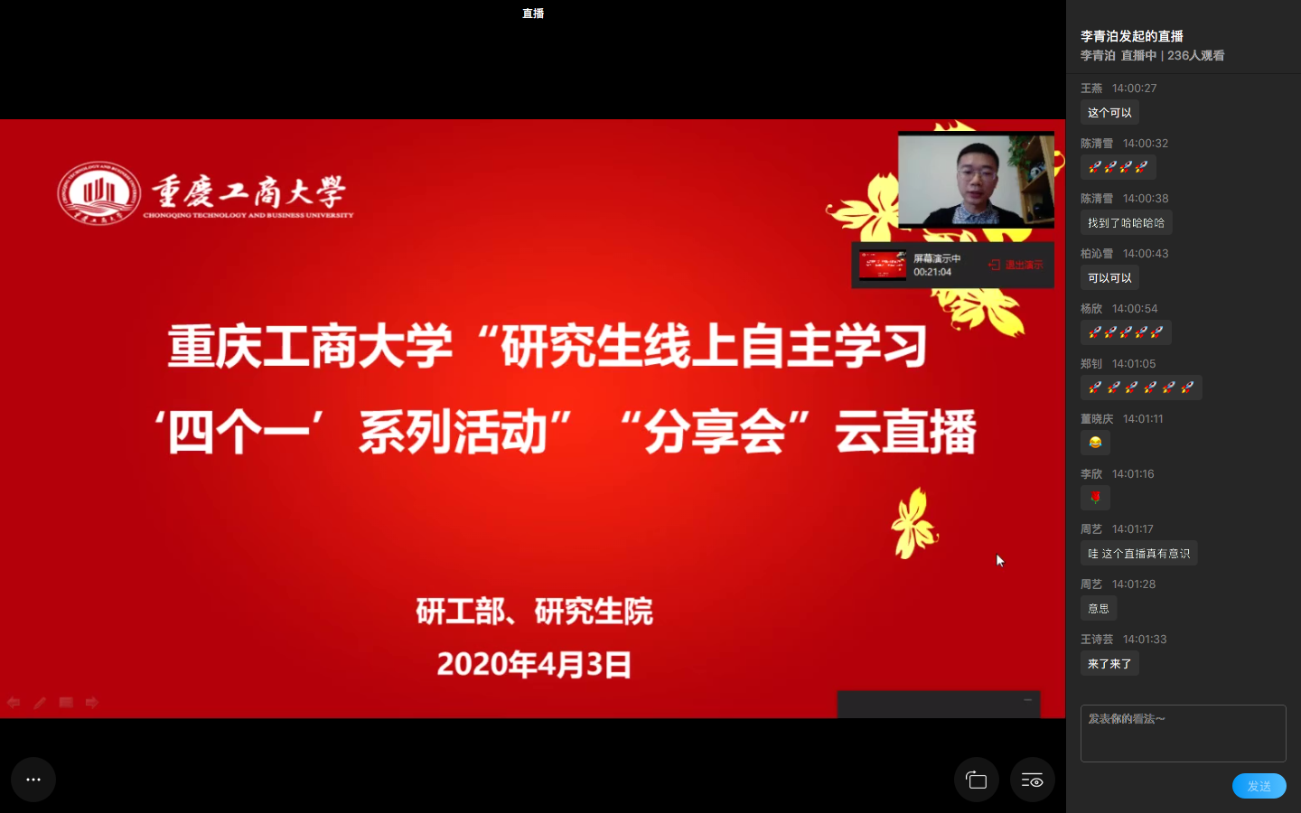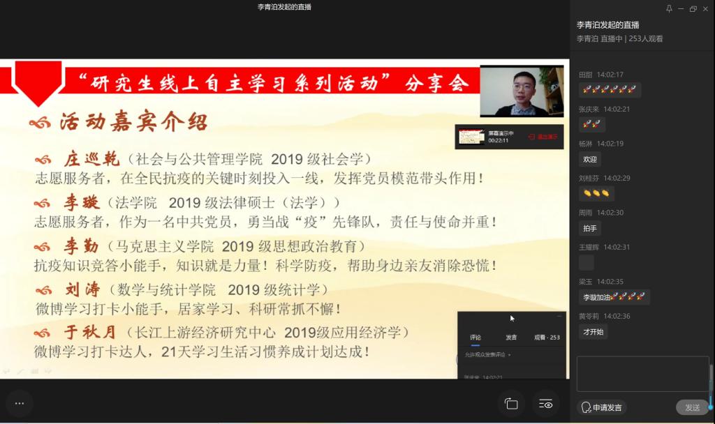 为回顾和总结前期研究生线上自主学习“四个一”系列活动中同学们取得的成绩,同时激发和引领更多的研究生同学在居家抗疫期间坚持不懈的积极学习,4月3日下午两点,研工部、研究生院主办举行了“研究生线上自主学习‘四个一’系列活动”“分享会”云直播。活动以访谈的形式,邀请了在“四个一”活动中表现突出的五位同学进行分享,研工部、研究生院领导、老师以及近500名研究生出席了本次活动。活动由研究生会副主席李青泊担任主持人。