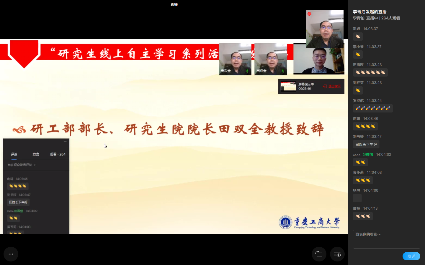 直播伊始,研工部部长、研究生院院长田双全对“四个一”系列活动表示了肯定,也对同学们在参与活动中的表现给与认可。田双全谈到,当前国内疫情虽然得到有效控制,但仍要提防外来输入病例和无症状感染病例,希望同学们不要放松警惕,在做好安全防护的同时,潜心学习,锻炼好身体,不断充实、提高自己。