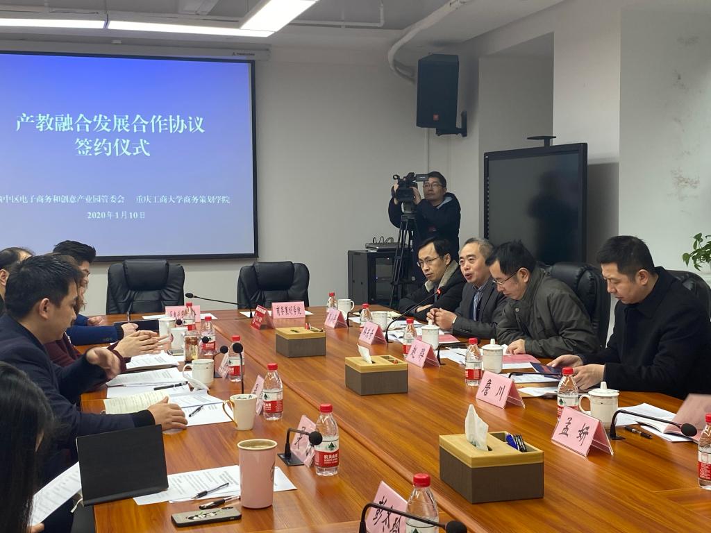 1月10日上午,商务策划学院与渝中区电子商务和创意产业园(简称:电创园)管委会签订产教融合发展合作协议。渝中区区政府副区长邹晓宇,白菜官网副校长赵骅,商务策划学院院长骆东奇、副院长詹川出席签约仪式。