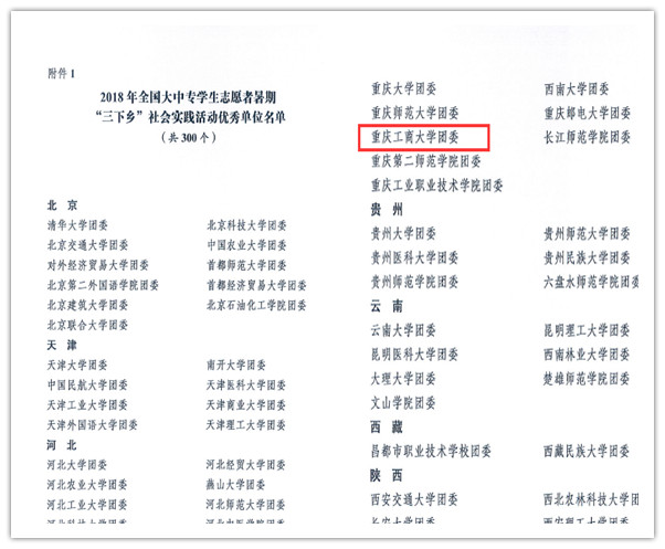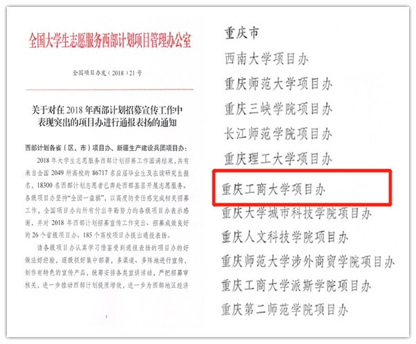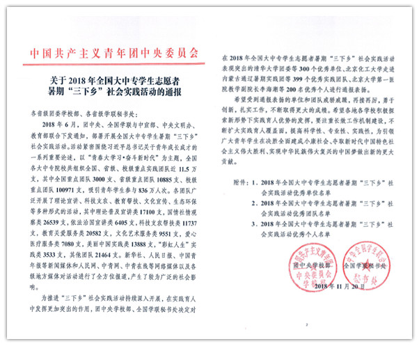 11月16日,全国大学生志愿服务西部计划项目管理办公室下发了《关于对在2018年西部计划招募宣传工作中表现突出的项目办进行通报表扬的通知》,对包括白菜官网在内的185个高校项目办提出通报表扬。11月20日,团中央学校部、全国学联秘书处下发了《关于2018年全国大中专学生志愿者暑期“三下乡”社会实践活动通报》,白菜官网校团委获评全国优秀单位(全国共评选300个)。